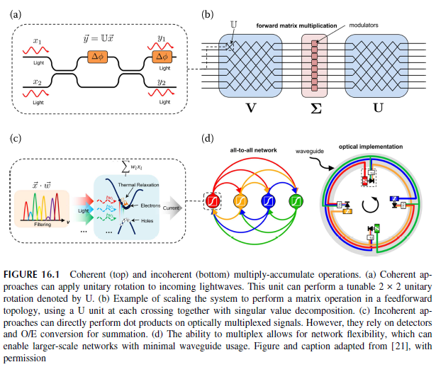对于硅光子学中的多重累加操作,人们已经探索出两种广泛的理念:相干和非相干。在图 16.1a-b 所示的相干框架中,分光镜和移相器控制着明确波长、模式和偏振的光的干涉。如果网格划分得当,任何单元变换都可以在光路编码的相干输入光束上进行,在波导中以光速直接实现矩阵-矢量乘法。这种方法最初被用于线性光子量子信息处理,并通过马赫-泽恩德调制器网格进行了演示[22]。由于相干方法与矢量-矩阵乘法同构,因此自然会发生求和。